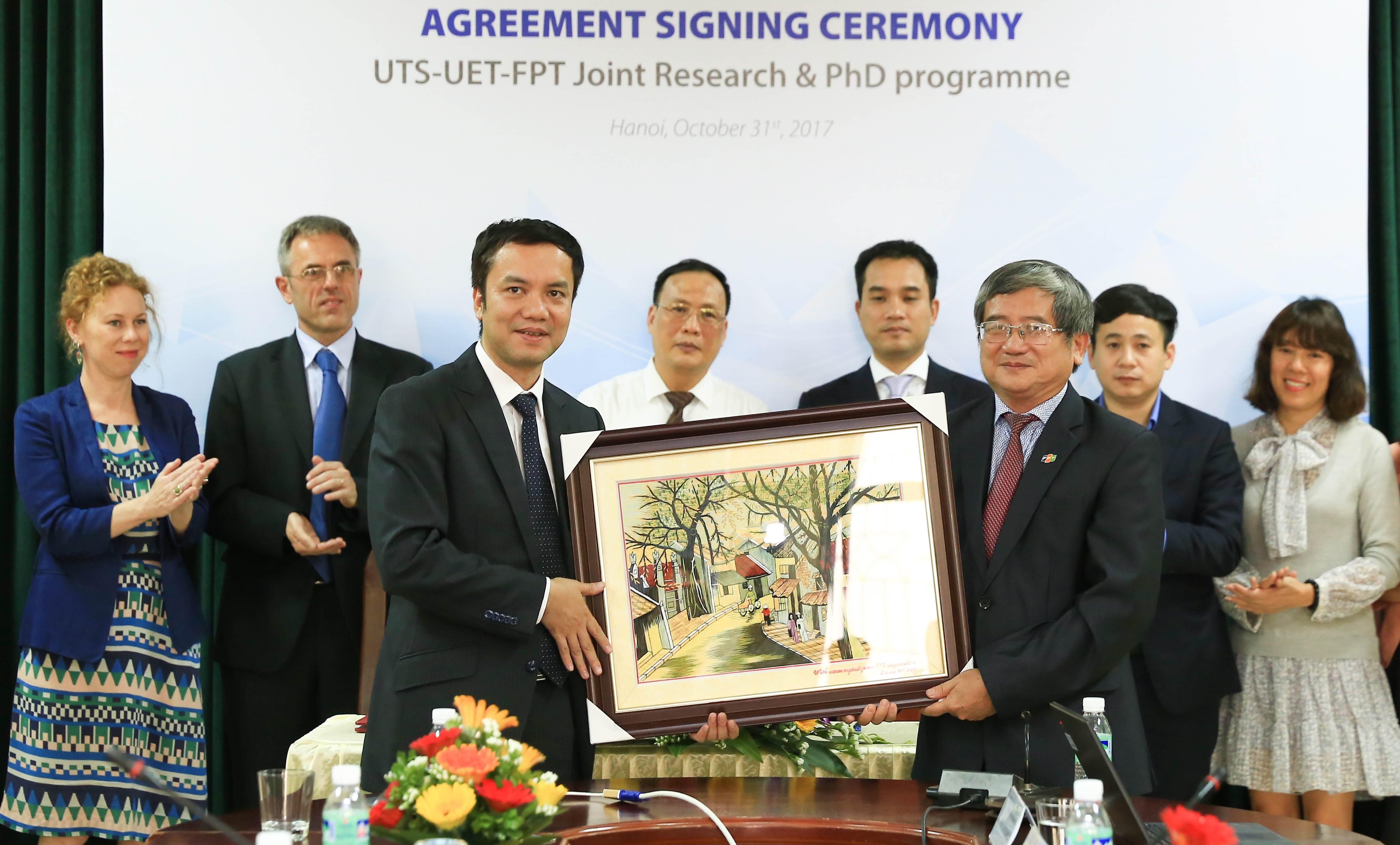 Chiều 31/10/2017, Tổng Giám đốc FPT Bùi Quang Ngọc cùng Hiệu trưởng Trường ĐH Công nghệ, ĐHQGHN (VNU – UET) Nguyễn Việt Hà và ông Ian Burnett, Chủ nhiệm Khoa Công nghệ thông tin, Trường ĐH Công nghệ Sydney, Úc (UTS) đã cùng kí kết thỏa thuận hợp tác trong đào tạo và phát triển nguồn nhân lực chất lượng cao.