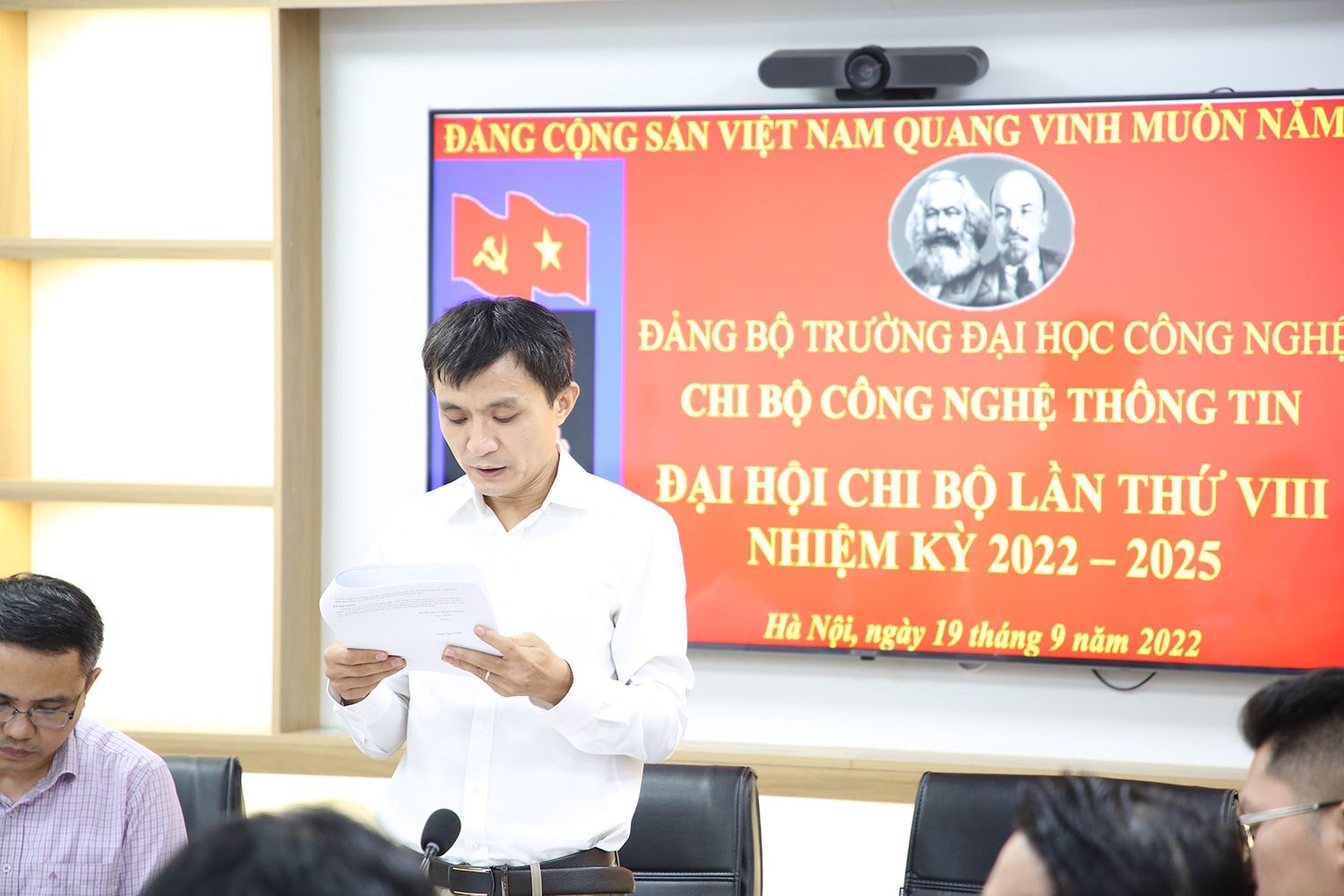 Đại hội với sự tham dự của đồng chí Chử Đức Trình – Phó Bí thư Đảng ủy, Phó Hiệu trưởng Trường Đại học Công nghệ – ĐHQGHN cùng các đảng viên Chi bộ Công nghệ thông tin (CNTT).