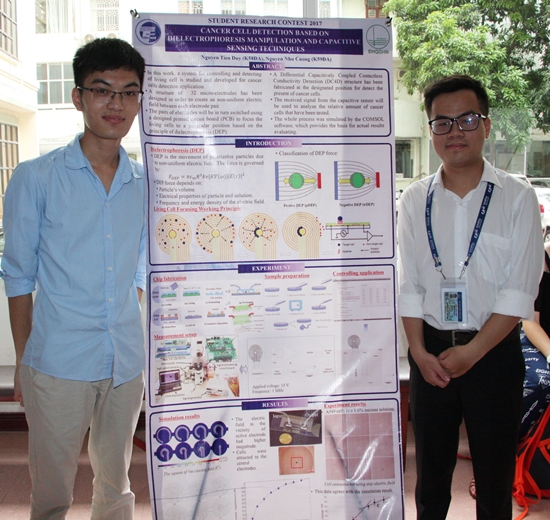 Đề tài “Phát hiện tế bào ung thư dựa vào công nghệ điện môi điện di và cảm biến điện dung” của hai sinh viên Khoa Điện tử viễn thông (Trường Đại học Công nghệ) đã đạt giải Nhất tại Hội nghị sinh viên nghiên cứu khoa học năm học 2016-2017 cấp trường và giải Nhất tại Giải thưởng sinh viên nghiên cứu khoa học cấp Đại học Quốc gia Hà Nội.