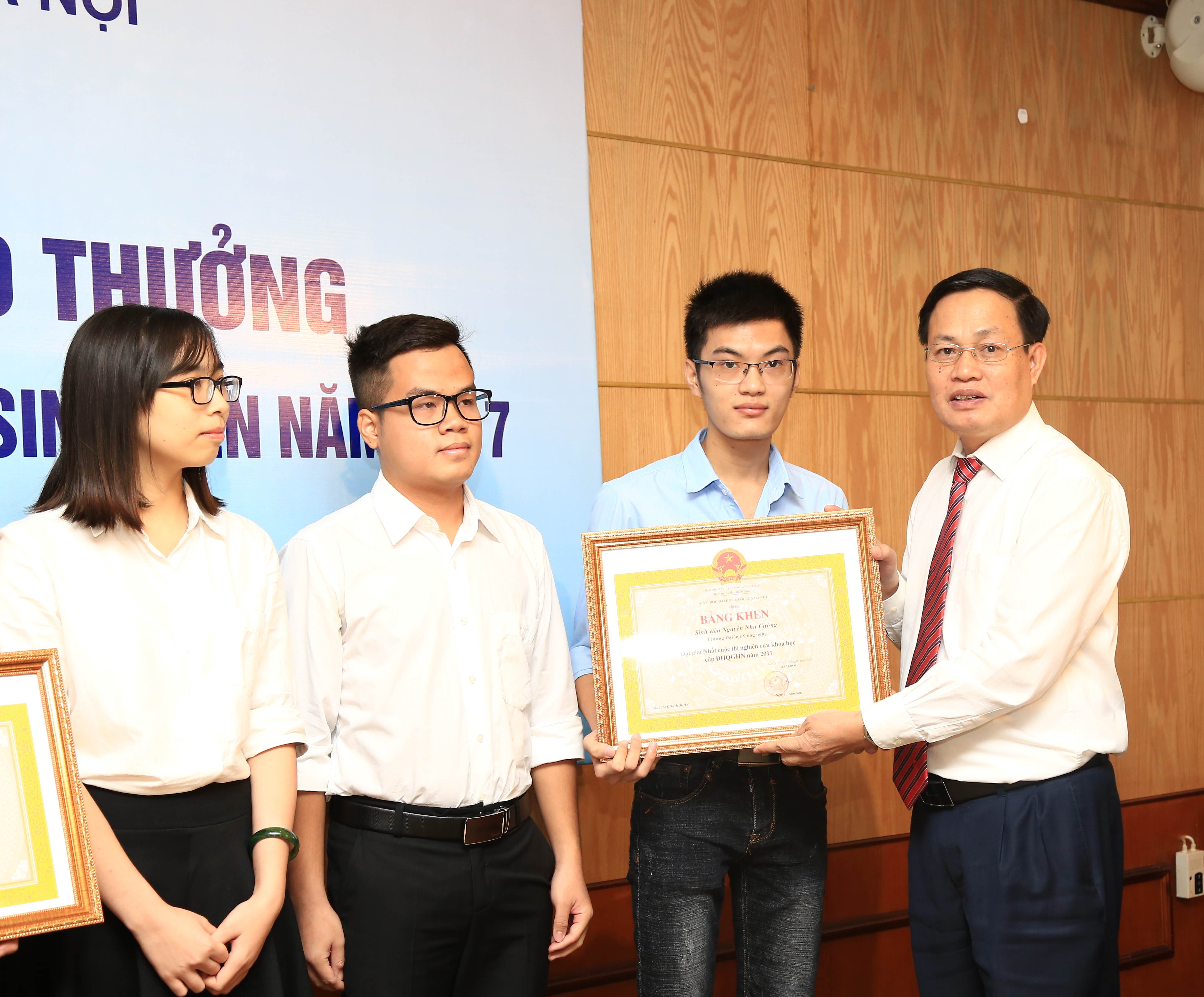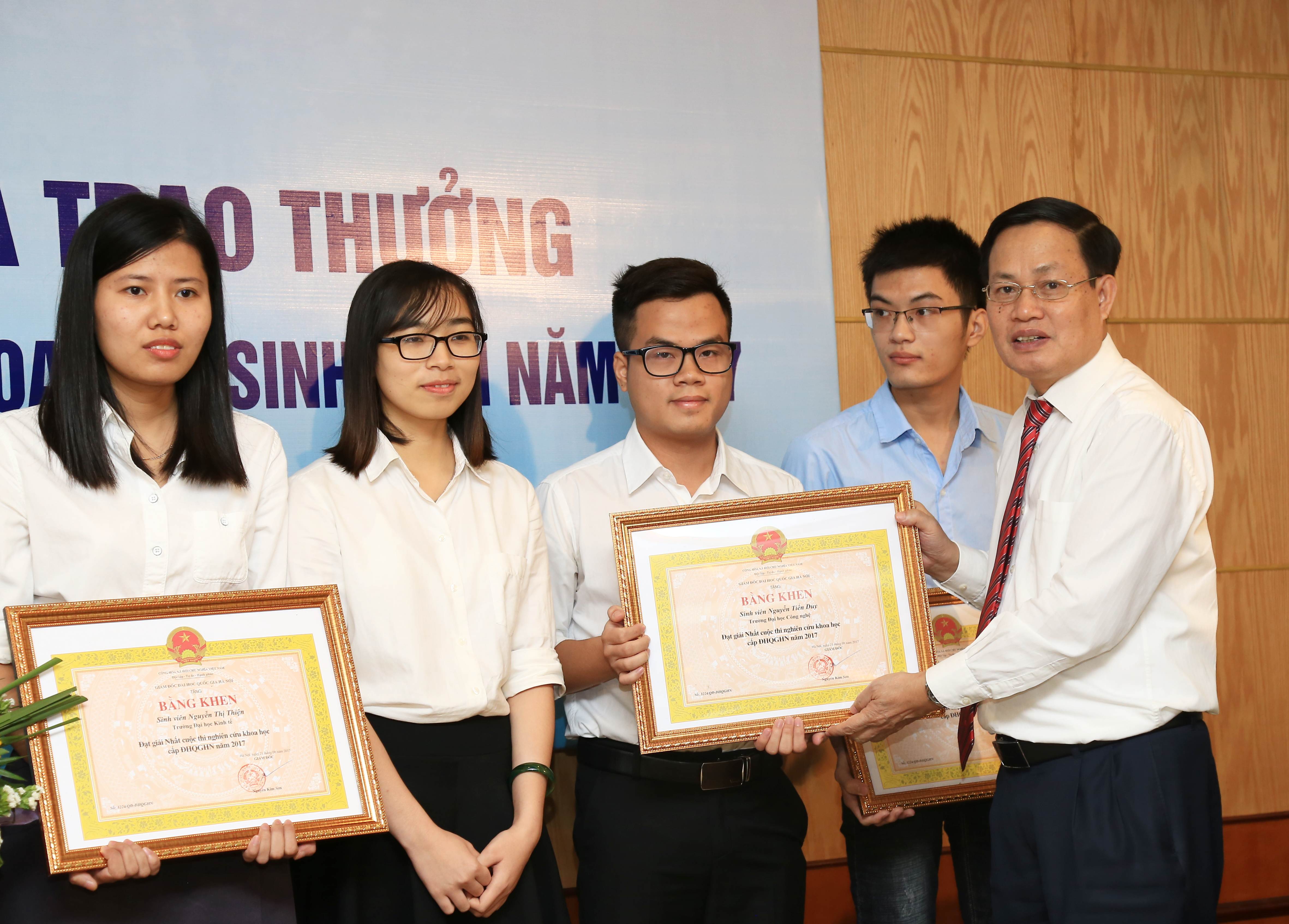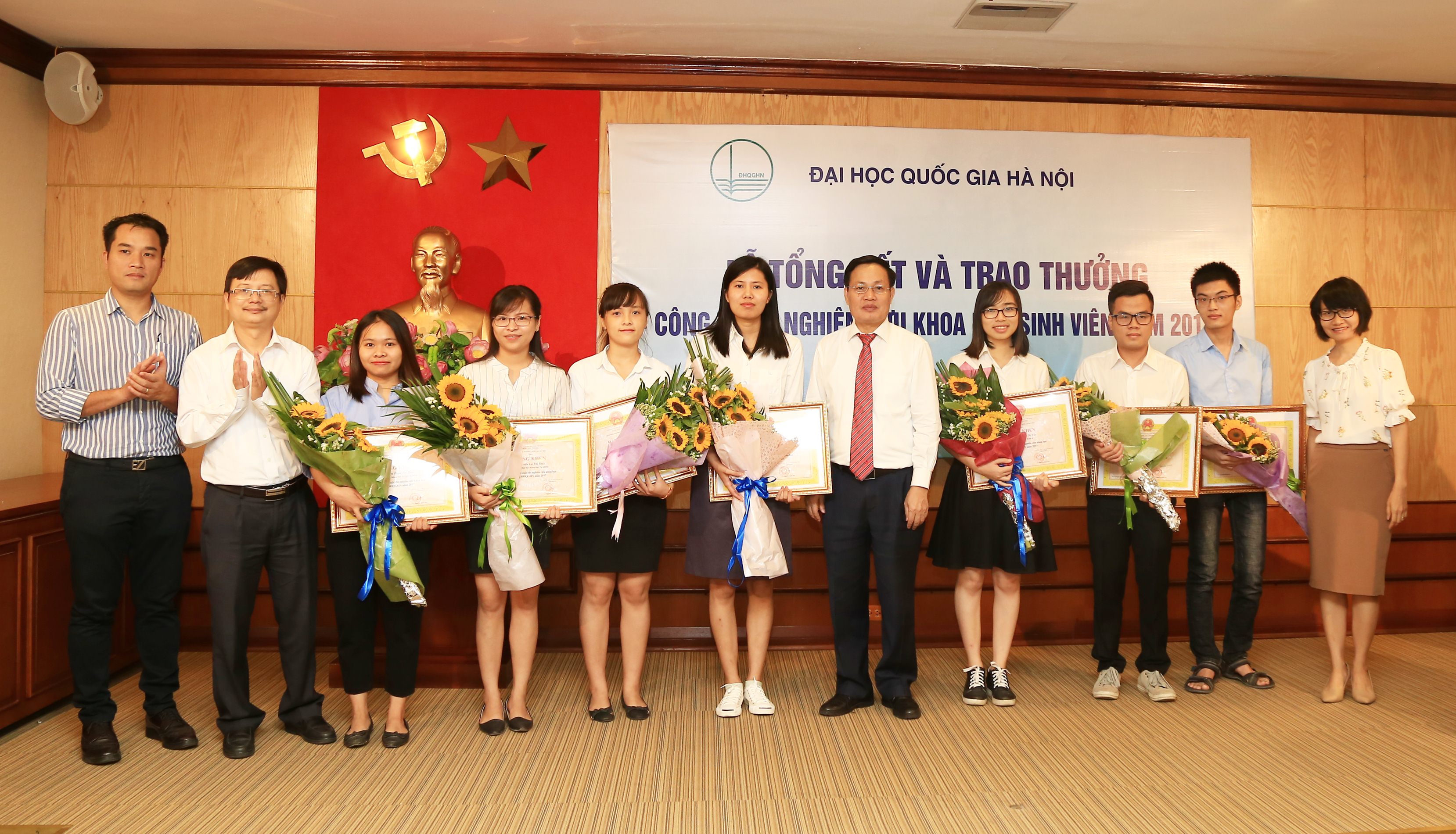 Nguyễn Tiến Duy (K58ĐA), Nguyễn Như Cường (K59ĐA) (lần lượt từ thứ hai và thứ ba bên phải ảnh) nhận Giải Nhất tại Giải thưởng sinh viên nghiên cứu khoa học cấp ĐHQGHN