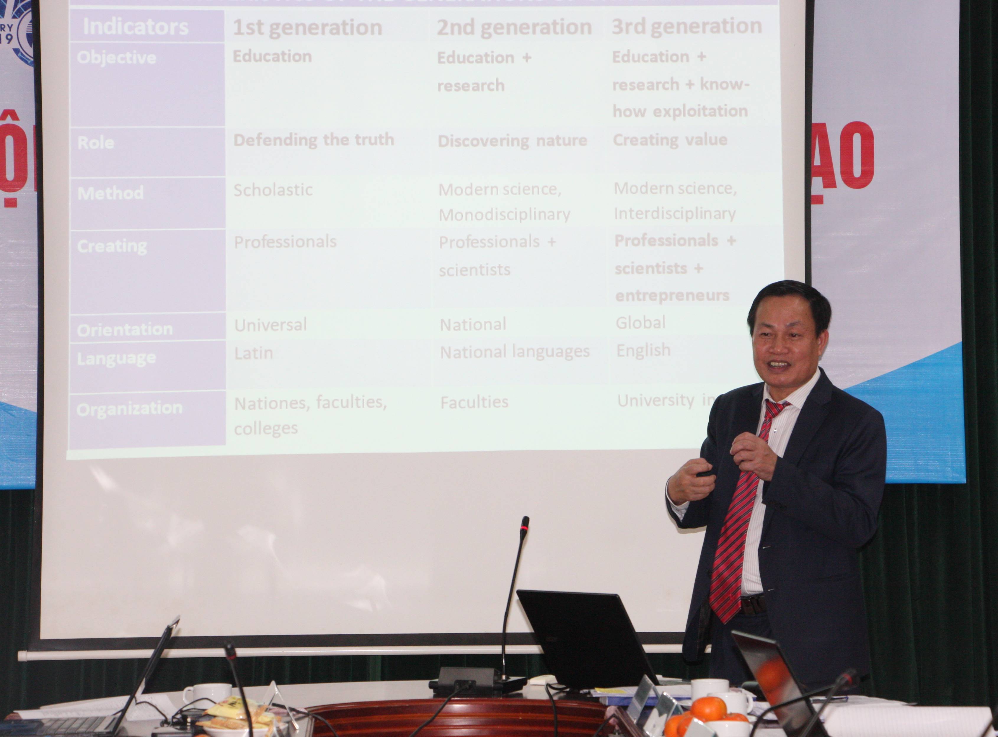 GS.TS Nguyễn Hữu Đức trình bày báo cáo “Tiếp cận mô hình đại học định hướng đổi mới sáng tạo”