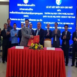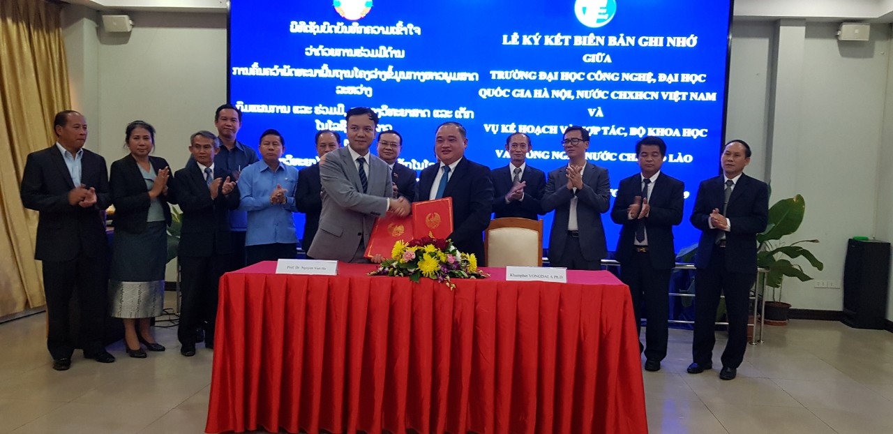 Chiều 15/11/2019, tại Trụ sở Bộ Khoa học Công nghệ nước Cộng hòa Dân chủ Nhân dân Lào đã diễn Lễ ký kết Biên bản ghi nhớ hợp tác Nghiên cứu và phát triển Hạ tầng dữ liệu không gian địa lý giữa Vụ kế hoạch và hợp tác, Bộ Khoa học và Công nghệ nước CHDCND Lào và Trường Đại học Công nghệ, Đại học Quốc gia Hà Nội nước CHXHCN Việt Nam.