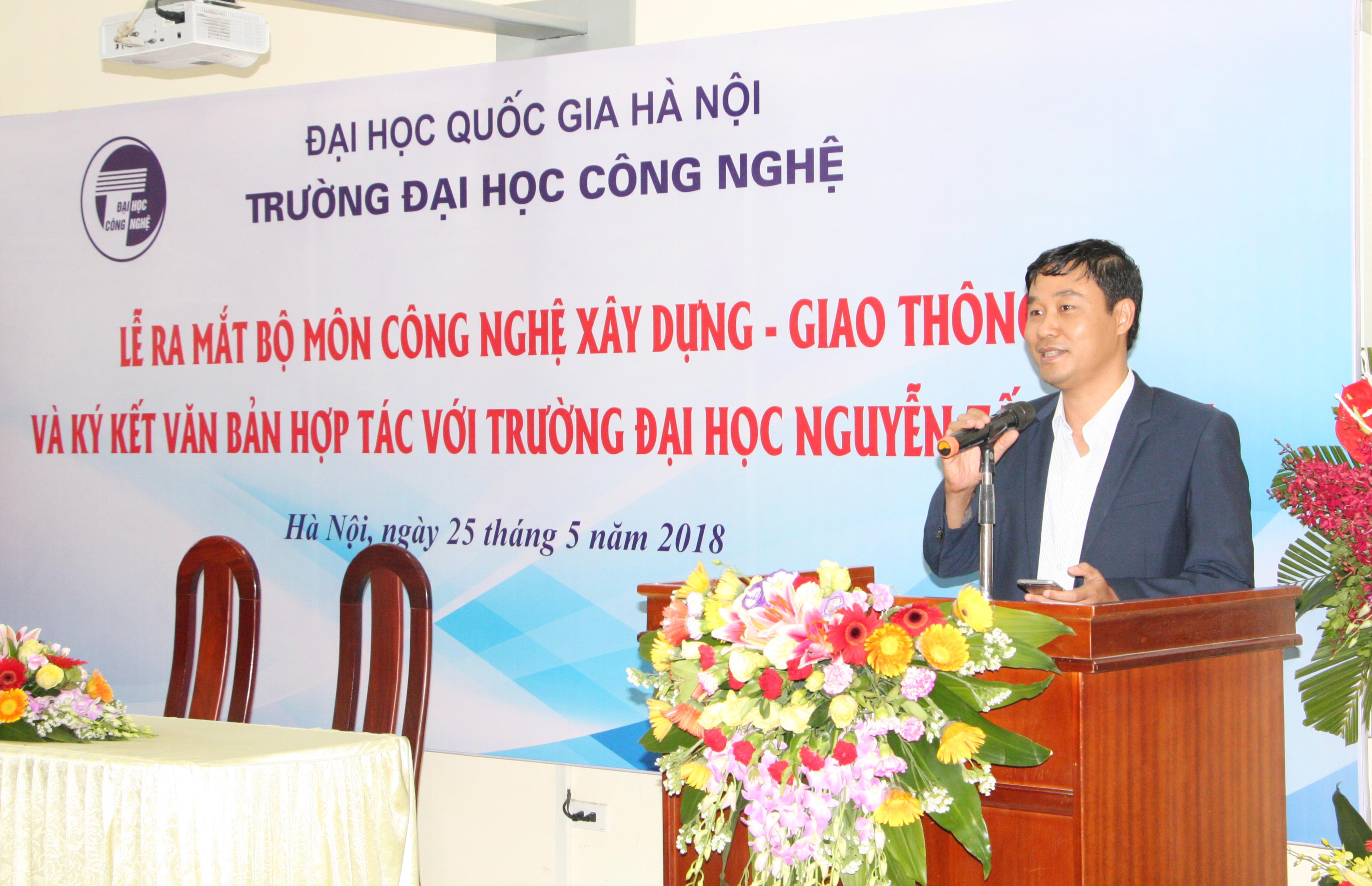 Phát biểu tại buổi lễ, PGS.TS. Nguyễn Việt Hà – Hiệu trưởng Trường ĐHCN chia sẻ từ ba năm trước nhà trường đã nhận diện nhu cầu cao của xã hội về nguồn nhân lực chất lượng cao trong lĩnh vực xây dựng hạ tầng, giao thông, dựa trên thế mạnh các ngành/lĩnh vực sẵn có, để chuẩn bị ra đời Bộ môn Công nghệ Xây dựng – Giao thông. Năm 2015, Nhà trường đã thành lập Phòng thí nghiên Vật liệu và Kết cấu tiên tiến triển khai nghiên cứu chuyên sâu về vật liệu mới và ứng dụng trong lĩnh vực xây dựng – giao thông. Năm 2017, trường mở ngành đào tạo kỹ sư công nghệ kỹ thuật xây dựng – giao thông và tuyển sinh từ năm học 2017-2018. Quá trình chuẩn bị có sự tham gia, hỗ trợ, hợp tác của nhiều cơ quan, doanh nghiệp hoạt động trong lĩnh vực này. Nay là thời điểm đủ chín để thành lập Bộ môn Công nghệ Xây dựng – Giao thông trực thuộc trường. Lãnh đạo Nhà trường kỳ vọng Bộ môn sẽ có bước phát triển mạnh, trở thành địa chỉ đào tạo, nghiên cứu chất lượng cao, trình độ cao trong lĩnh vực xây dựng – giao thông.