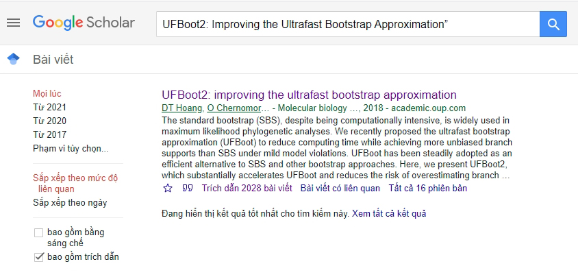 Bắt đầu từ năm 2018, nhóm tác giả gồm tôi cùng với PGS.TS. Lê Sỹ Vinh và TS. Bùi Quang Minh cùng các cộng sự tại Trung tâm Tin sinh tích hợp (CIBIV, University of Vienna, Áo) đã công bố công trình trên tạp chí Molecular Biology and Evolution (MBE). Tạp chí MBE có chỉ số ảnh hưởng 5 năm là 13.4, được xếp vào Q1 trong cả 3 lĩnh vực Sinh thái học, Tiến hóa, Hành vi và Hệ thống học; Di truyền và Sinh học phân tử nên tiêu chuẩn rất cao.