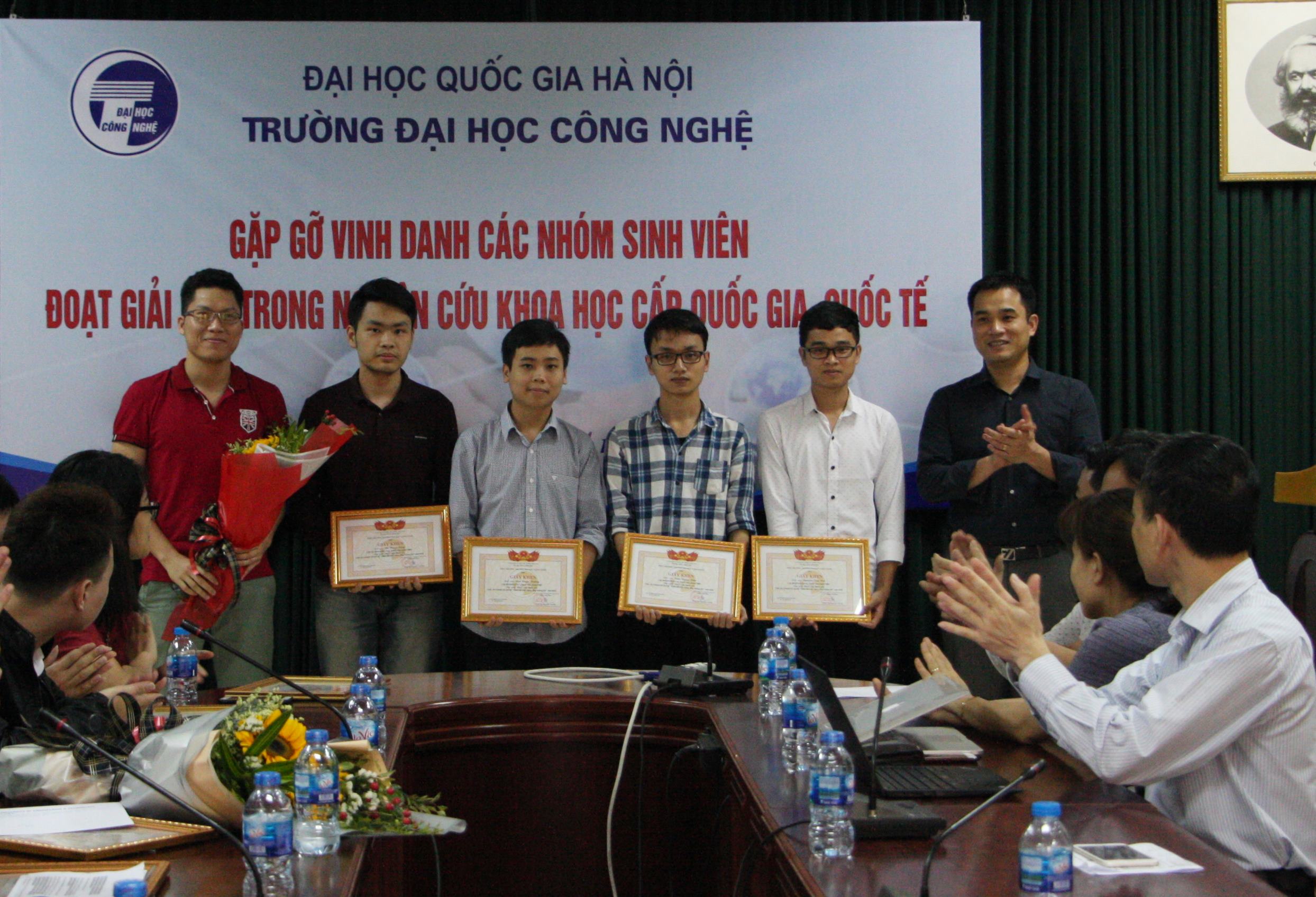 Nhóm FIMO đã giành giải Nhất cuộc thi Cansat 2017-2018 nhận khen thưởng từ Phó Hiệu trưởng Phạm Bảo Sơn (ngoài cùng, bên phải ảnh) và TS. Dương Lê Minh – Phó Chủ nhiệm khoa CNTT (ngoài cùng bên trái ảnh)