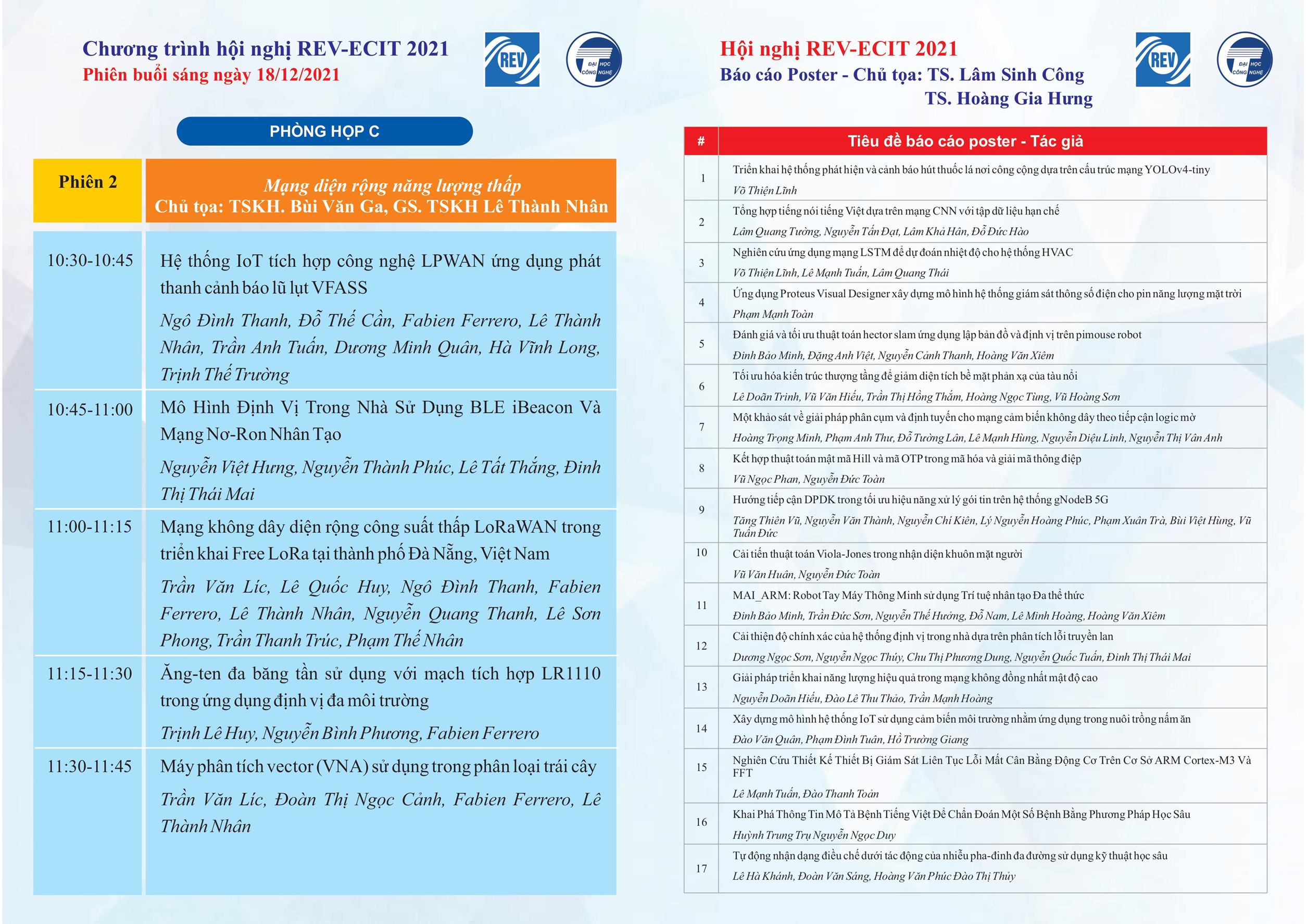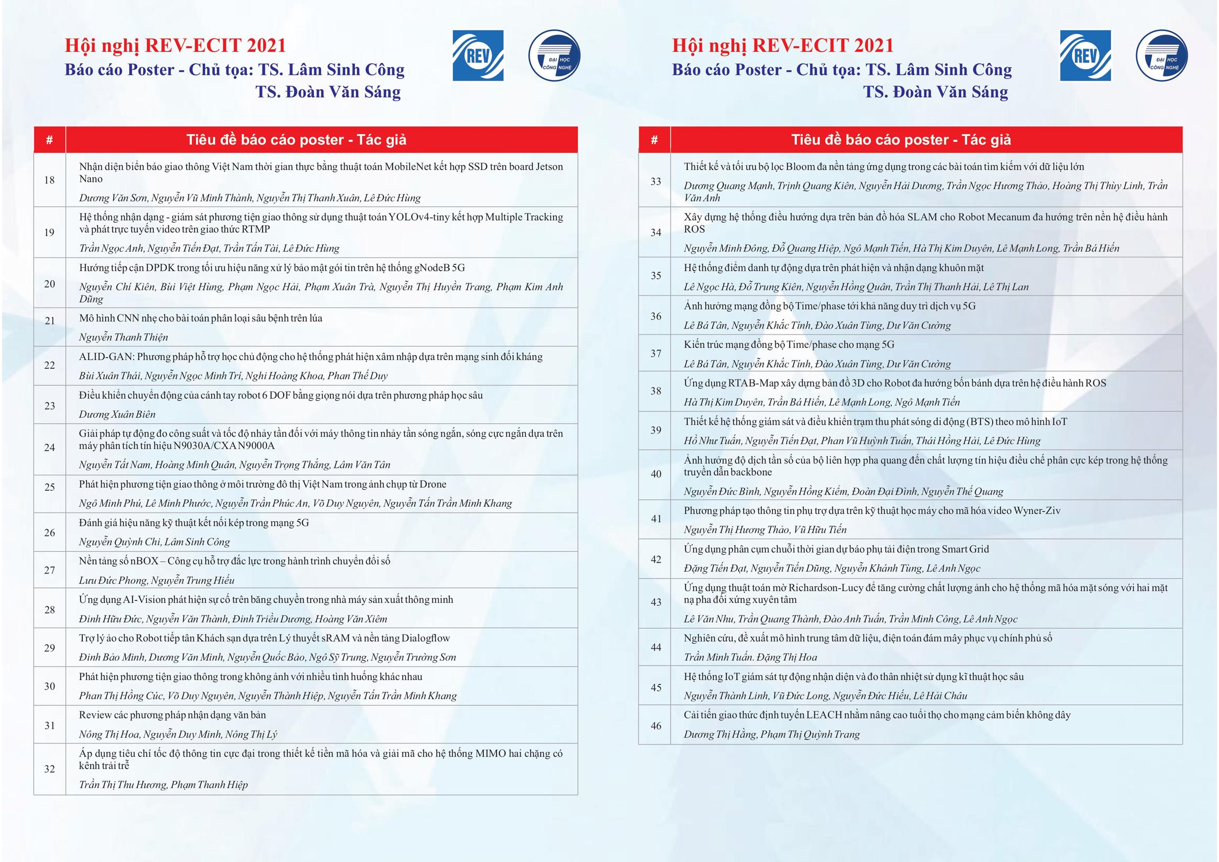 Phiên Hội thảo khoa học có 33 báo cáo do các diễn giả đến từ các trường Đại học và Viện nghiên cứu trình bày. Bên cạnh đó, có 46 poster trình bày về các sản phẩm và đề tài nghiên cứu được thục hiện tại các cơ quan quản lý, công ty nghiên cứu và sản xuất thiết bị, vàcác nhà cung cấp giải pháp.