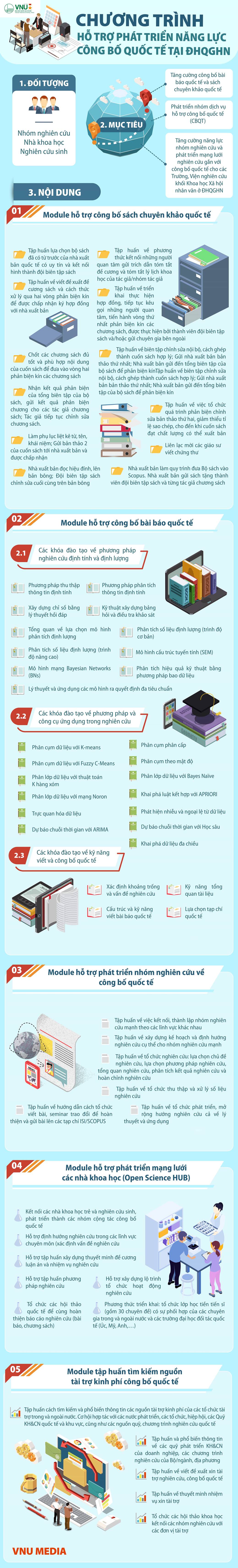 Chương trình hỗ trợ phát triển năng lực công bố quốc tế cho nhóm nghiên cứu, nhà khoa học và nghiên cứu sinh ở ĐHQGHN gồm 05 module nhằm tăng cường năng lực nghiên cứu và phát triển mạng lưới nghiên cứu gắn với công bố quốc tế cho các Trường, Viện nghiên cứu khối Khoa học Xã hội nhân văn.