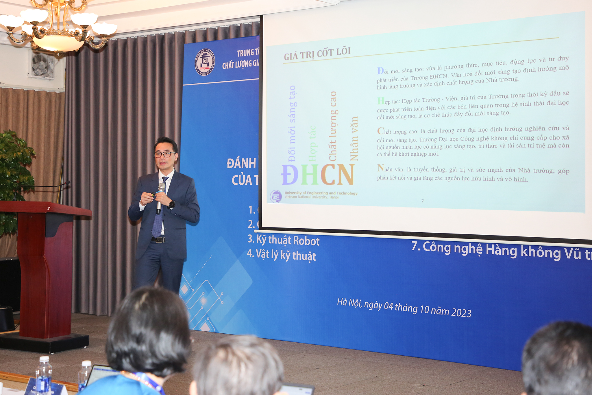 Tại chương trình, GS.TSKH Nguyễn Đình Đức – Chủ tịch Hội đồng Trường ĐH Công nghệ trân trọng chào đón đoàn đánh giá ngoài, GS khẳng định, kiểm định chất lượng giáo dục là hoạt động quan trọng của nhà trường, thông qua đó toàn thể lãnh đạo, cán bộ, giảng viên của nhà trường cùng tiến hành rà soát, nhìn nhận và đánh giá hiệu quả các hoạt động một cách toàn diện, từ đó đưa ra các giải pháp nhằm tiếp tục nâng cao và hoàn thiện chất lượng đào tạo của nhà trường. Giáo sư cũng bày tỏ sự tin tưởng với những chuyên gia trong lĩnh vực kiểm định chất lượng sẽ có những đánh giá công tâm, khách quan và chính xác hoạt động đào tạo của Nhà trường. Trường Đại học Công nghệ tự hào khi các lĩnh vực của Nhà trường những năm gần đây luôn được xếp hạng trong các bảng xếp hạng đại học thế giới như THE, QS, …. Năm 2023, trong 6 lĩnh vực của ĐHQGHN được xếp hạng bởi QS WUR by subject 2023, có 4 lĩnh vực thuộc sự quản lý, đào tạo của Trường Đại học Công nghệ đó là: