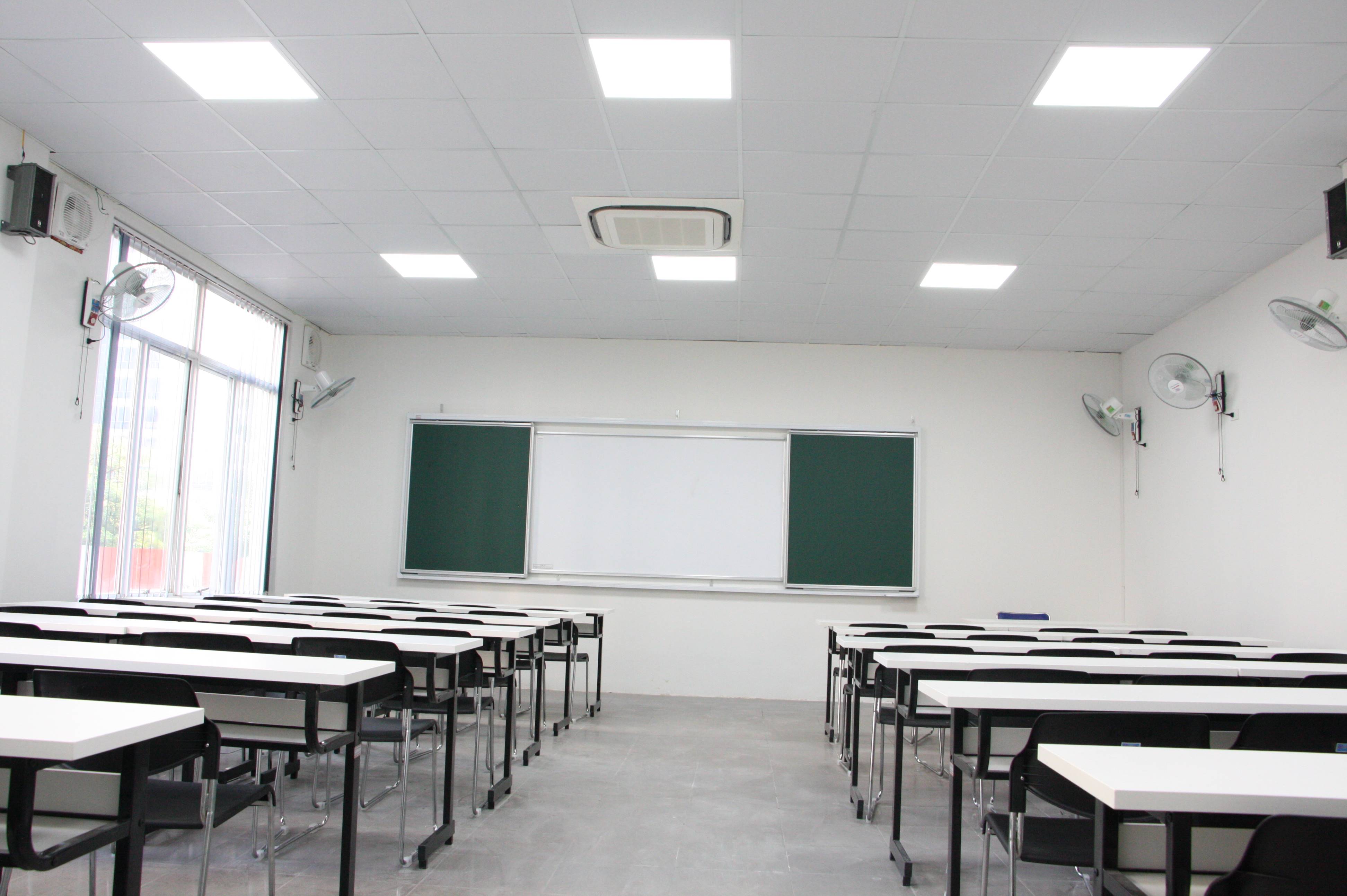 Khu giảng đường có diện tích 1300 m2 gồm 15 phòng học có sức chứa từ 40-60 chỗ ngồi, đáp ứng quy mô 700 sinh viên/ca học. Các phòng học được thiết kế, đầu tư mới đồng bộ, hiện đại đáp ứng tiêu chuẩn chất lượng cao: hệ thống điều hòa trung tâm; hệ thống cửa kính cách âm và cách nhiệt để đảm bảo môi trường học tập yên tĩnh; hệ thống đèn LED chiếu sáng; các lớp học được trang bị máy chiếu, bảng trượt hai lớp và bàn ghế mới.