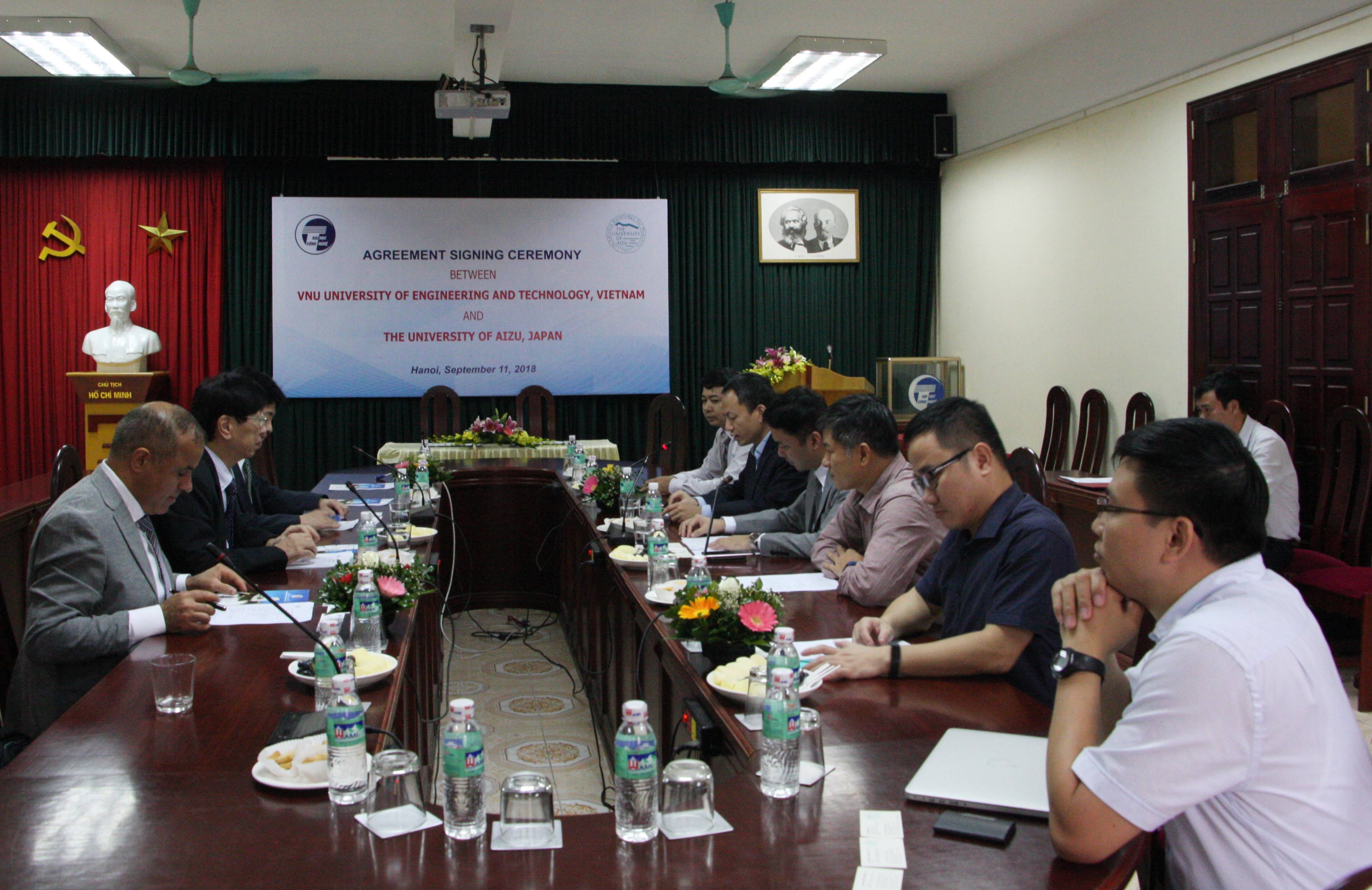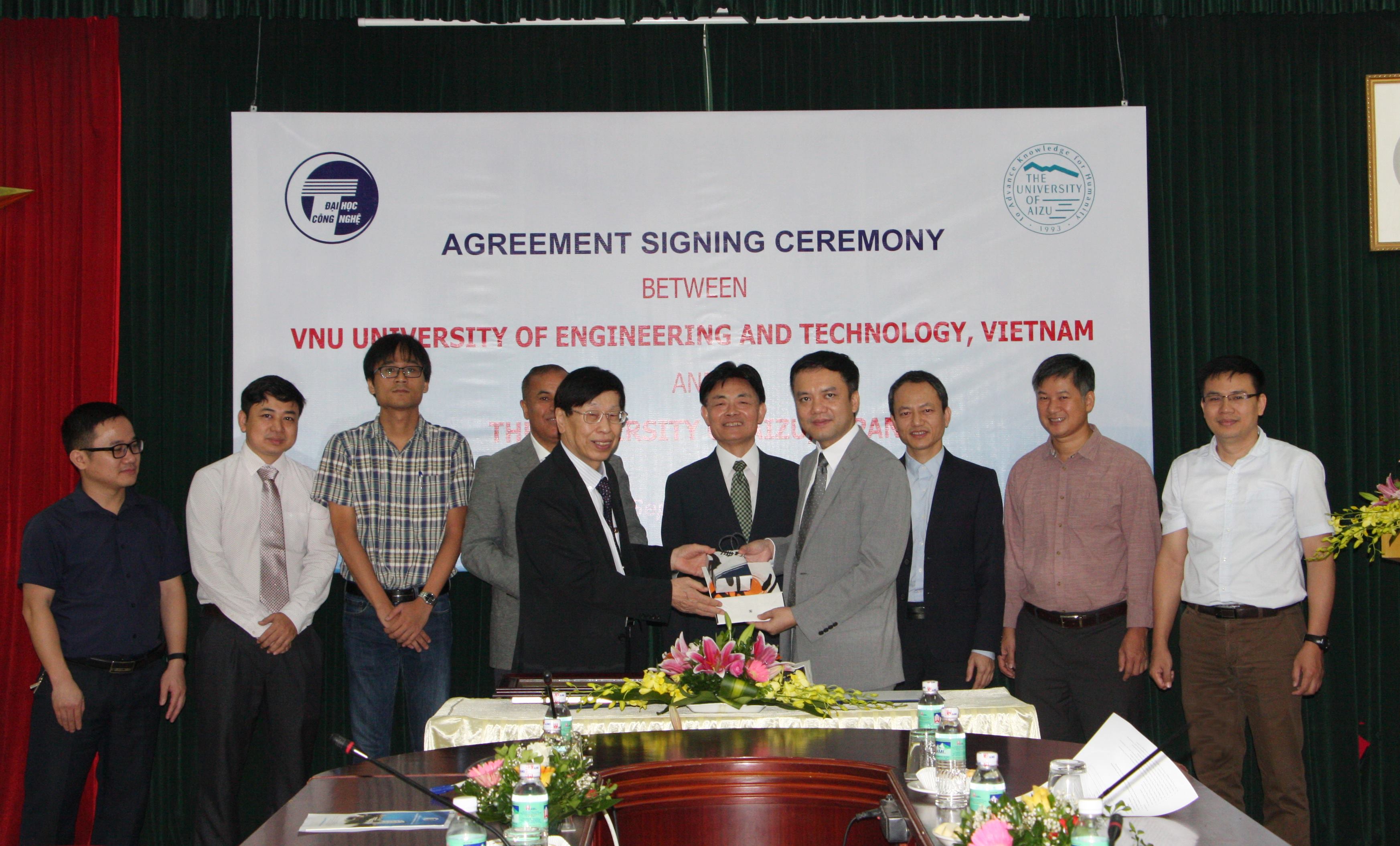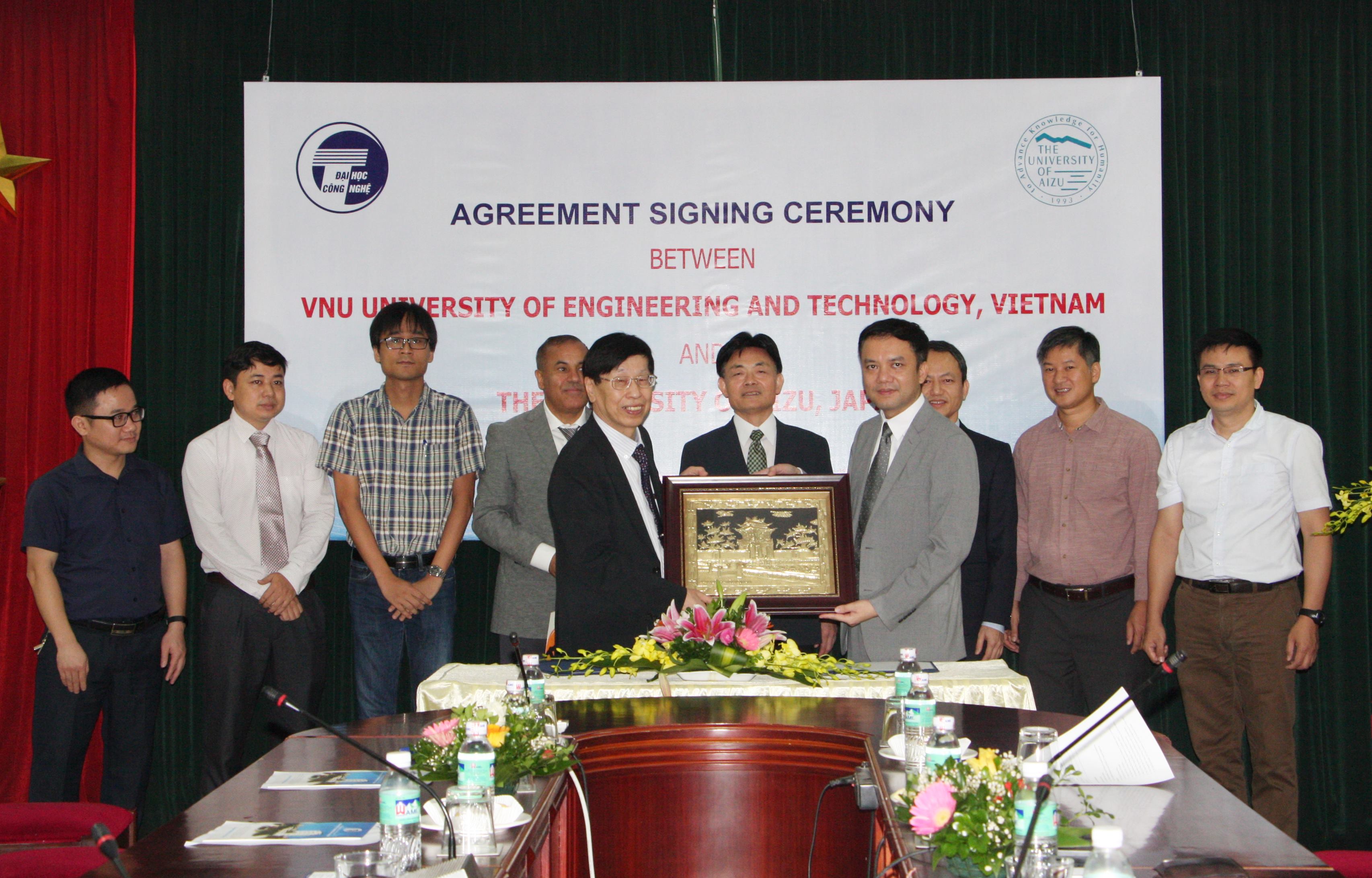 Phát biểu tại lễ ký kết, Hiệu trưởng Nguyễn Việt Hà cho biết Trường Đại học Aizu là đối tác hợp tác của Nhà trường trong lĩnh vực đào tạo, nghiên cứu. Năm 2012, Nhà trường đã ký kết văn bản thỏa thuận hợp tác lần đầu về nghiên cứu khoa học, trao đổi học thuật, xây dựng chương trình đào tạo và đến năm 2017 đã chính thức ký hợp tác cụ thể việc cấp học bổng đào tạo theo chương trình 2 + 2. Qua quá trình hợp tác, hai bên đã có những hoạt động hợp tác như trao đổi giảng viên, nghiên cứu viên, xây dựng các nhóm hợp tác nghiên cứu chung, phối hợp cùng nhau tổ chức các hội nghị khoa học quốc tế và chia sẻ kinh nghiệm quản trị đại học tiên tiến… Đến nay, Trường ĐHCN đã có hai sinh viên ngành Công nghệ thông tin và ngành Điện tử viễn thông sau thời gian học 2 năm tại Việt Nam được chuyển tiếp sang học 2 năm tại Đại học Aizu và nhận bằng tốt nghiệp tại Nhật. Nhà trường hy vọng hợp tác giữa Trường Đại học Aizu với Trường ĐHCN nói riêng và ĐHQGHN nói chung sẽ mở ra những cơ hội mới nhằmkhuyến khích các giảng viên, nhà khoa học của hai bên tham gia tích cực các hoạt động nghiên cứu trong các đề tài khoa học chung, thậm chí thành lập phòng thí nghiệm phối thuộc, để đóng góp vào sự nghiệp phát triển giáo dục đại học và công nghệ.