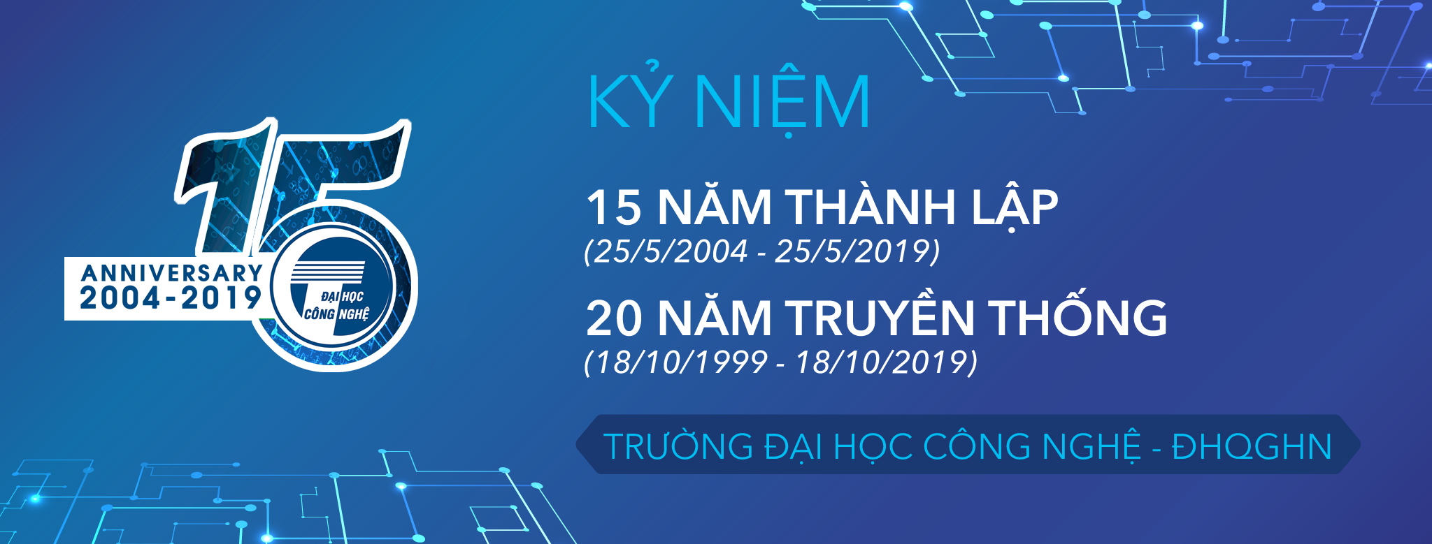 Nhân dịp kỉ niệm 15 năm thành lập (2004-2019) và 20 năm ngày truyền thống (1999-2019), Trường Đại học Công nghệ công bố các mẫu banner, backdrop sử dụng trong các hoạt động của Nhà trường năm 2019 (click chuột phải vào ảnh để tải về máy). Hoặc tải file thiết kế tại Ấn phẩm truyền thông online.