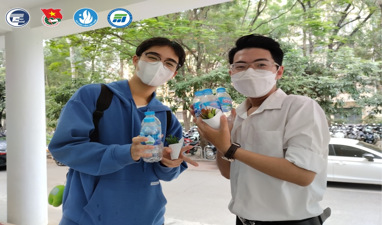 Sinh viên Nguyễn Thanh Tùng (ngoài cùng, bên phải ảnh) – Liên chi Khoa Công nghệ thông tin tham gia hoạt động “Đổi rác thải nhựa lấy cây”.