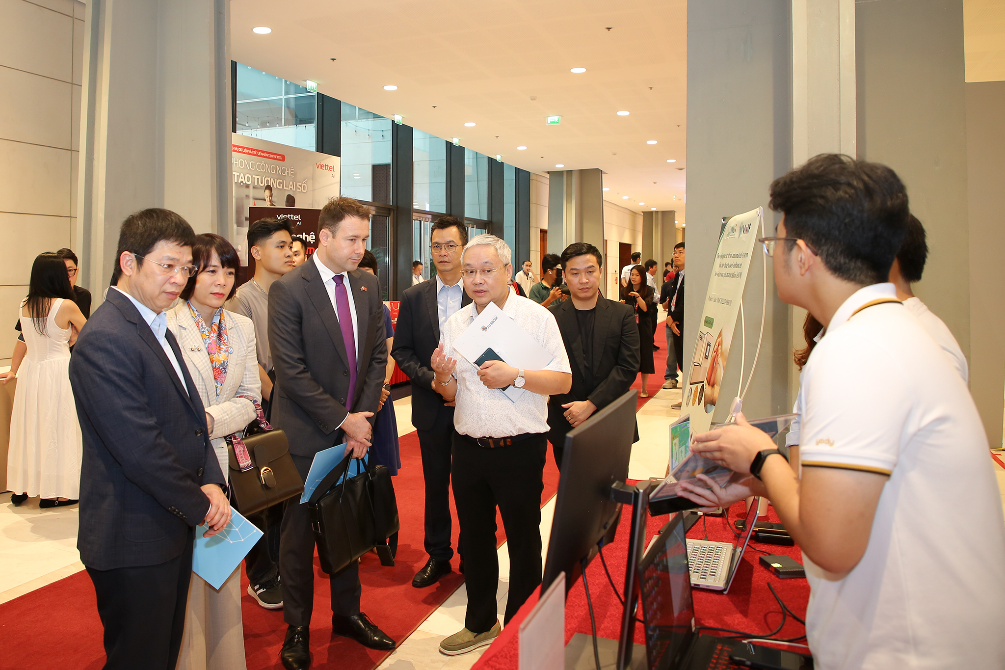 TS. Kim Wimbush – Tham tán CSIRO kiêm Giám đốc Chương trình Aus4Innovation tại Việt Nam tham quan gian trưng bày các sản phẩm nghiên cứu của Trường ĐH Công nghệ