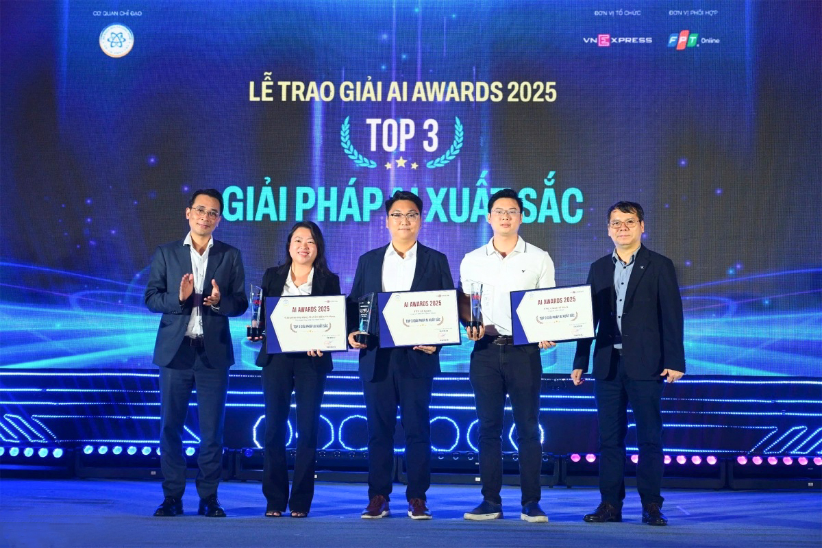 GS.TS Chử Đức Trình (bìa trái ảnh) – Hiệu trưởng Trường Đại học Công nghệ, Đại học Quốc gia Hà Nội và TS. Nguyễn Tuấn Khang (bìa phải ảnh) – Lãnh đạo khu vực, Khối Nền tảng dữ liệu và AI, IBM khu vực Đông Nam Á trao giải cho Top 3 Giải pháp AI xuất sắc của AI Awards 2025