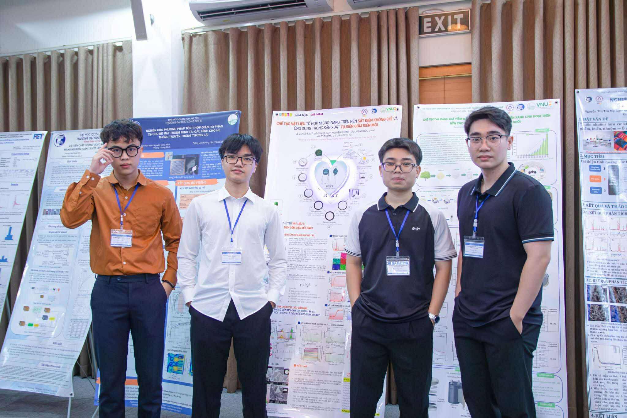 Các thành viên nhóm nghiên cứu ngành Kỹ thuật Năng lượng khóa QH-2021 tham dự Hội nghị Sinh viên nghiên cứu khoa học cấp Trường năm 2025 (từ phải qua trái: Lê Quang Kiên, Nguyễn Phong Hào, Đặng Hữu Vinh và Vũ Quang Đạt).