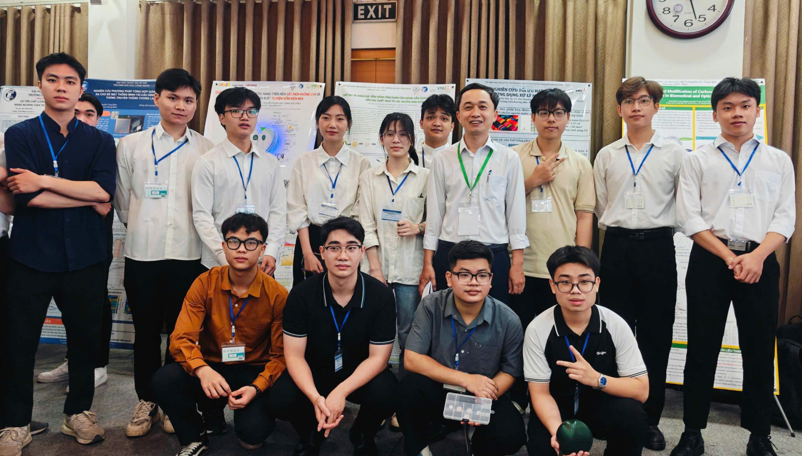TS. Bùi Đình Tú – Phó Chủ nhiệm Khoa Vật lý kỹ thuật và công nghệ nano (đứng thứ tư, bên phải ảnh) chụp ảnh cùng các nhóm sinh viên nghiên cứu tại hội nghị Sinh viên nghiên cứu khoa học cấp Trường
