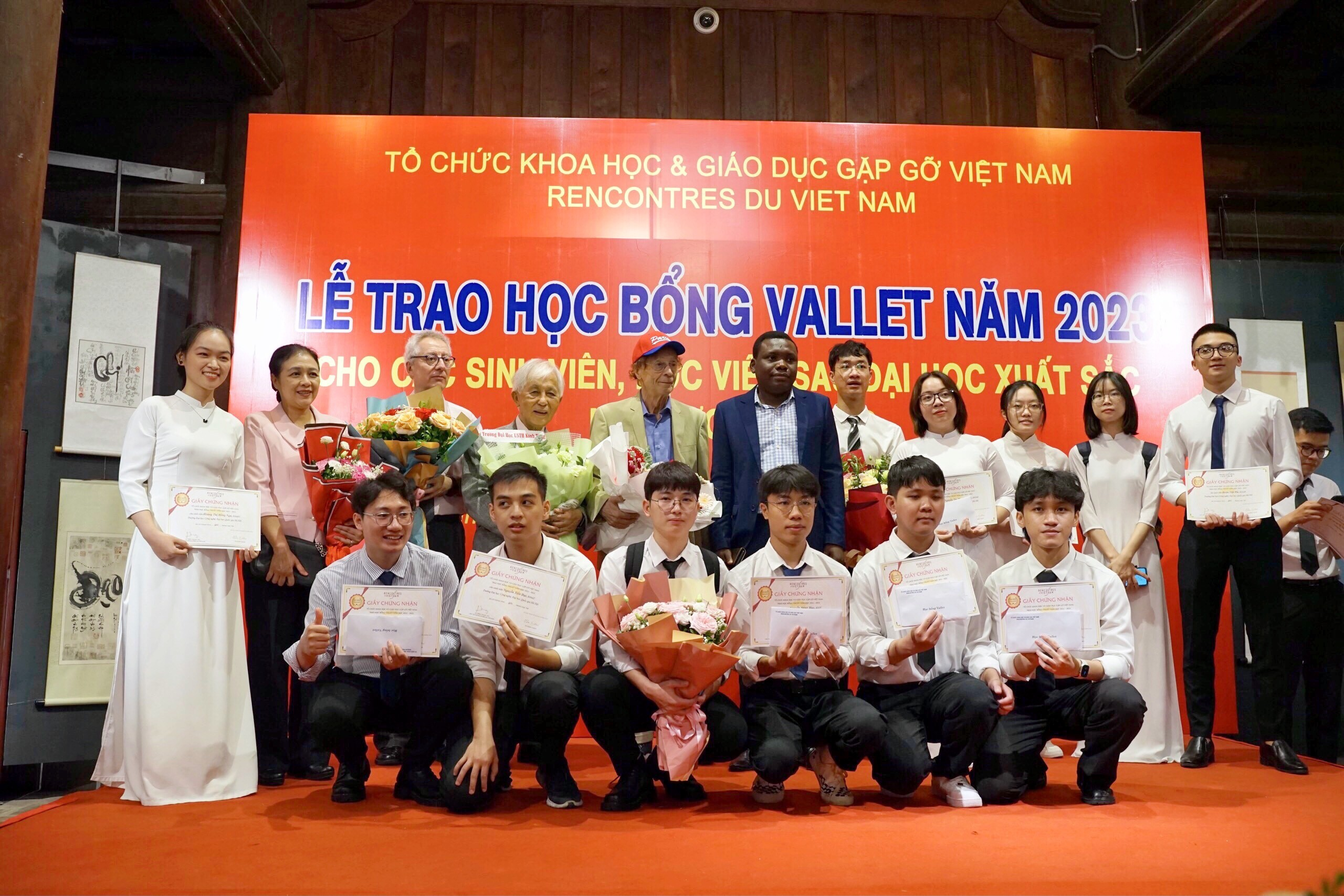 Sinh viên Đinh Trọng Thăng (đứng thứ 5, bên trái ảnh sang) nhận học bổng Vallet