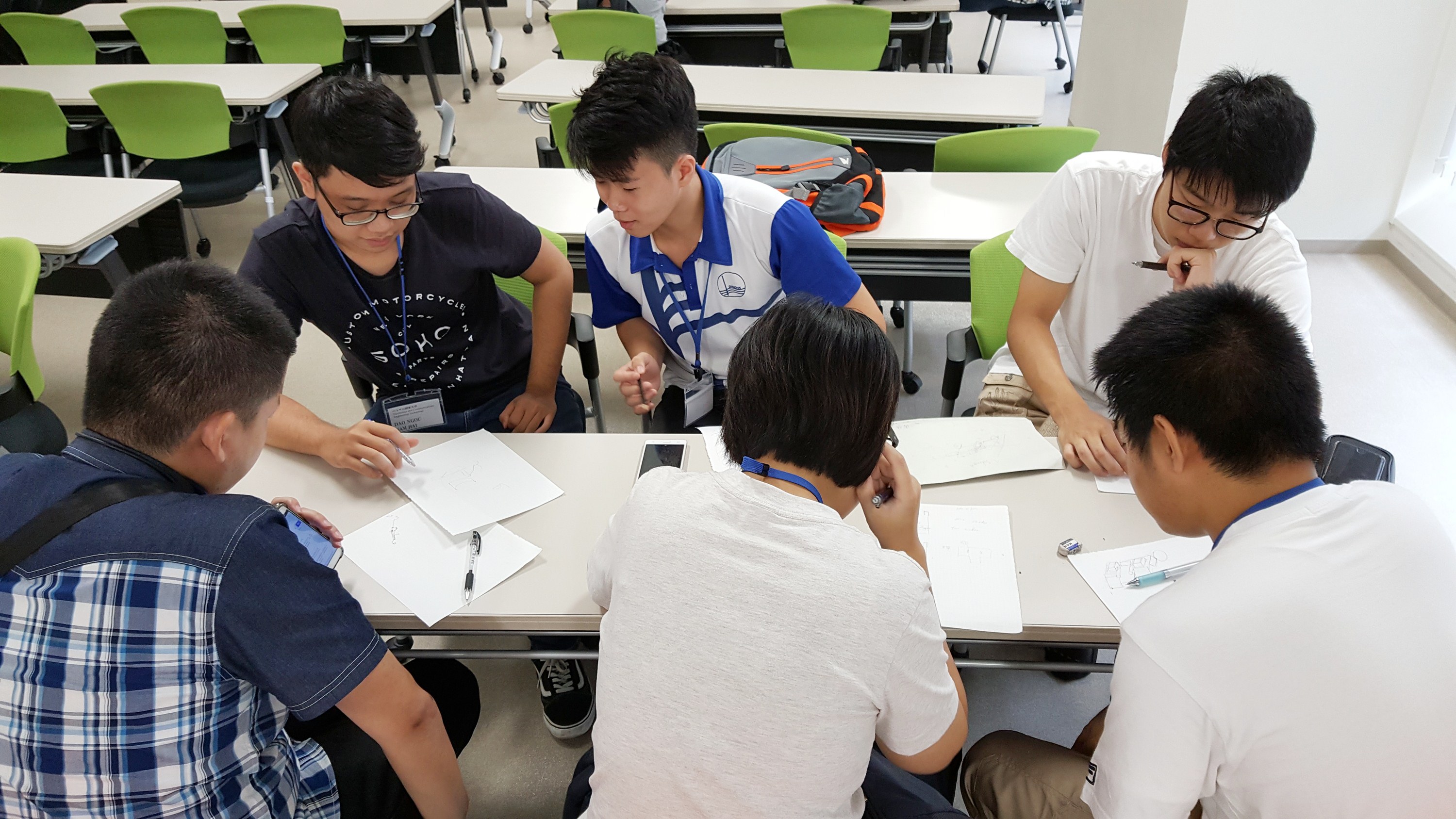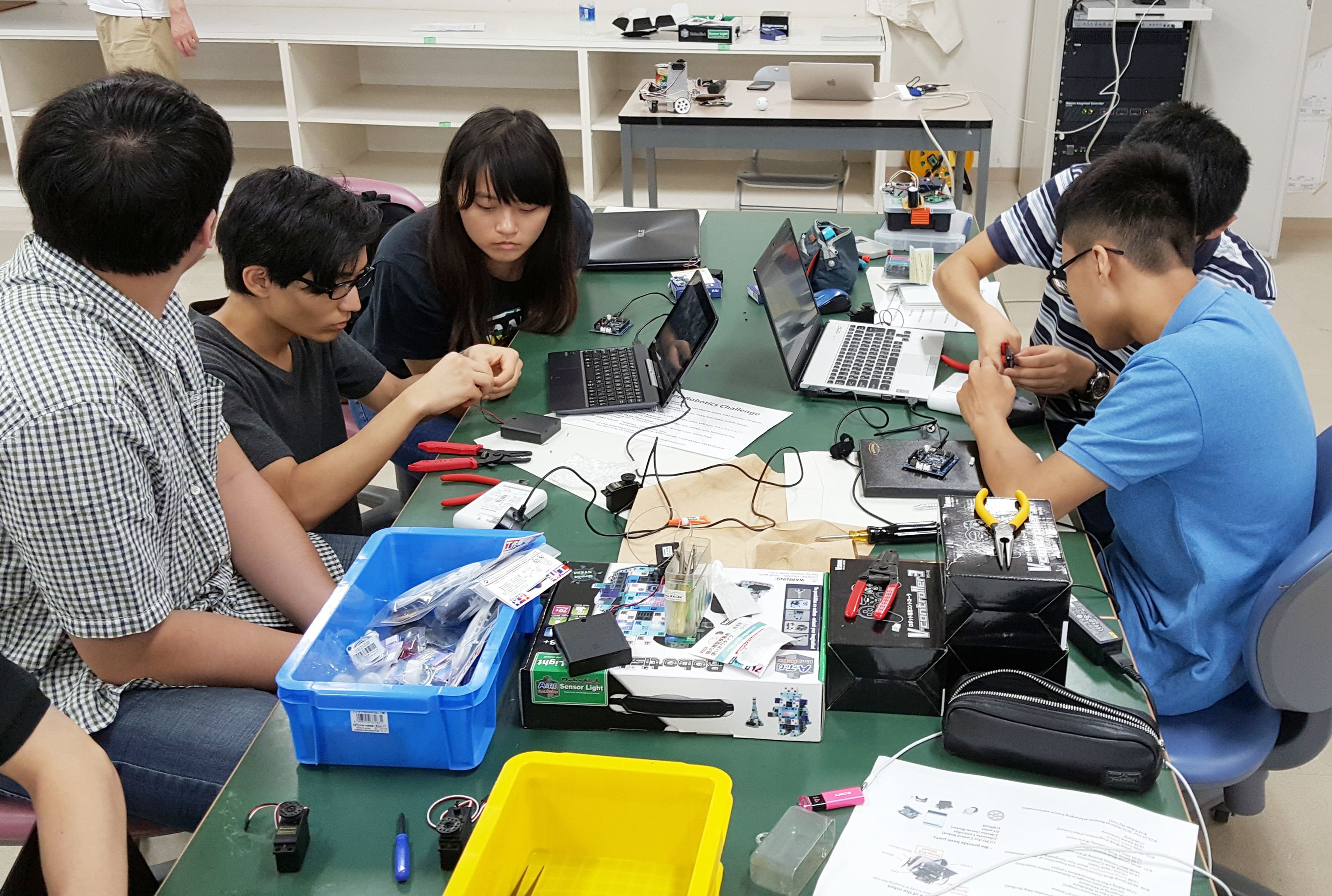Sinh viên chia nhóm để tham gia khóa học về robot trong chương trình trao đổi, làm việc, học tập ngắn hạn của cán bộ, sinh viên Trường ĐHCN tại Trường ĐH Chiba vào tháng 8/2017