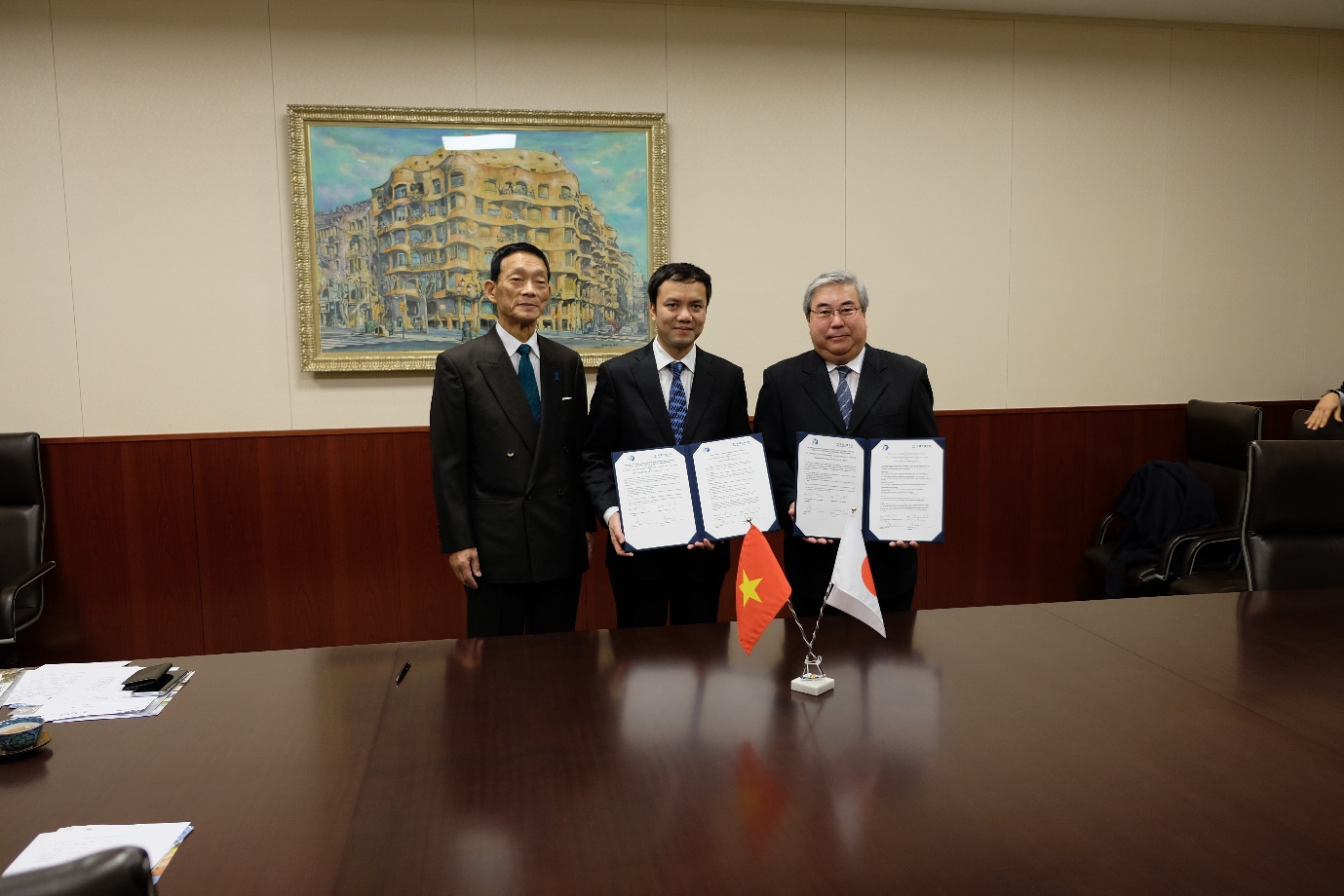 Chủ tịch hội đồng quản trị Osamu Setokuma (bên trái), GS. Kazuhito Komiya (bên phải) và PGS.TS. Nguyễn Việt Hà (ở giữa) ký kết thỏa thuận hợp tác