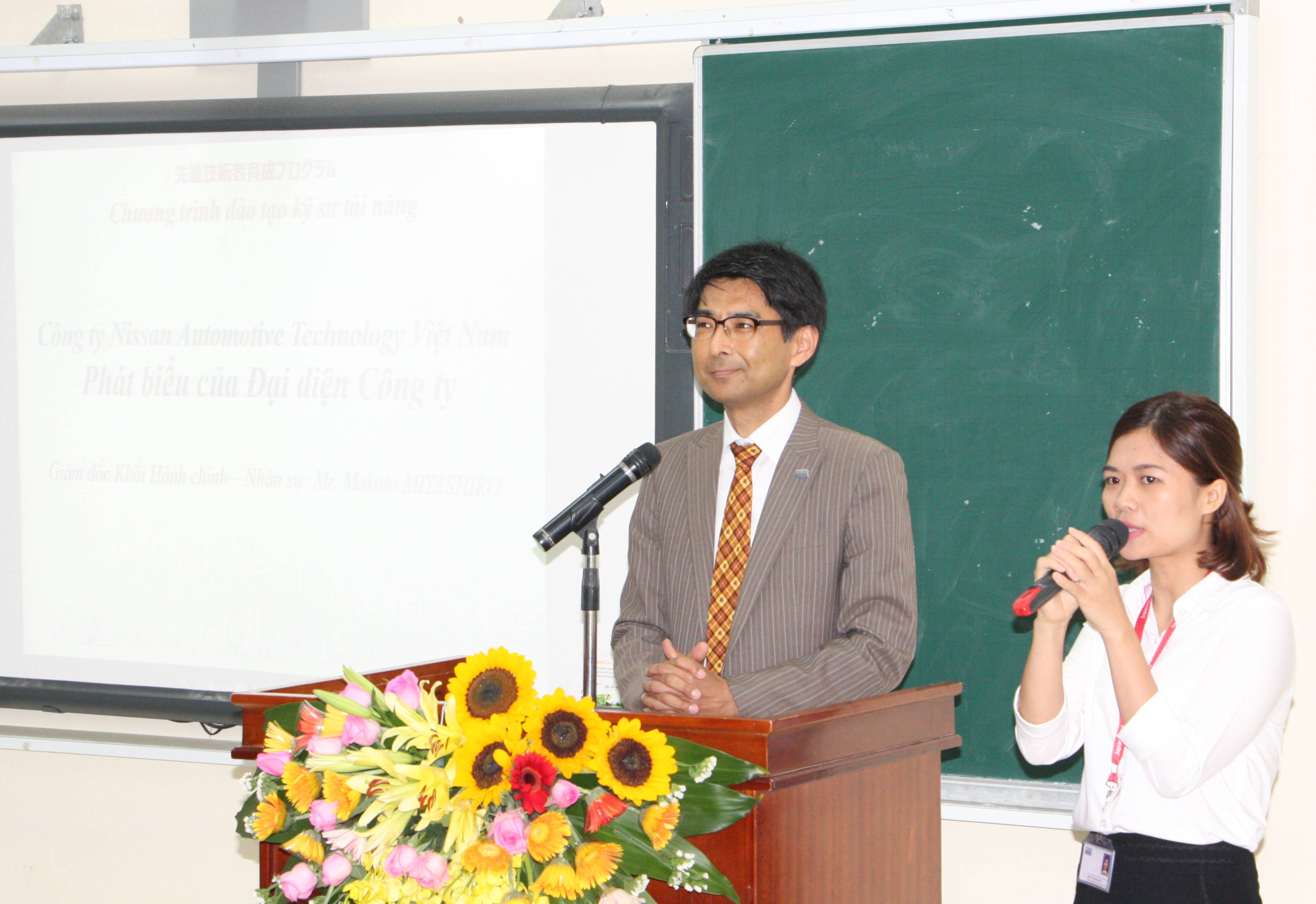 Giám đốc Miyashiro Mokato bày tỏ sự vui mừng khi sự hợp tác đầu tiên giữa Trường ĐHCN và Công ty NATV được đánh dấu bởi việc phối hợp trong hoạt động đào tạo và tuyển dụng. Ông Miyashiro Mokato chia sẻ về lĩnh vực sản xuất ô tô của Tập đoàn Nissan nói chung và Công ty NATV nói riêng. Mặc dù, công ty NATV là công ty đang thiết kế 65% dữ liệu CAD đối với xe Nissan trên toàn thế giới, nghĩa là hầu hết dữ liệu CAD của xe được làm hoàn toàn tại Việt Nam. Tuy nhiên, lượng xe Nissan tiêu thụ chiếm khoảng 30% thị trường xe ô tô ở Việt Nam. Do vậy, công ty vẫn đang tiếp tục tìm kiếm những ứng viên tài năng tham gia lĩnh vực nghiên cứu phát triển ô tô. Các bạn sẽ cảm thấy tự hào khi khi bản thân có thể sản xuất những chiếc xe ô tô được toàn thế giới sử dụng. Sinh viên tham gia chương trình đào tạo sẽ được tiếp cận kiến thức, kỹ năng liên quan đến sản xuất ô tô và có cơ hội được tuyển dụng làm việc tại công ty.