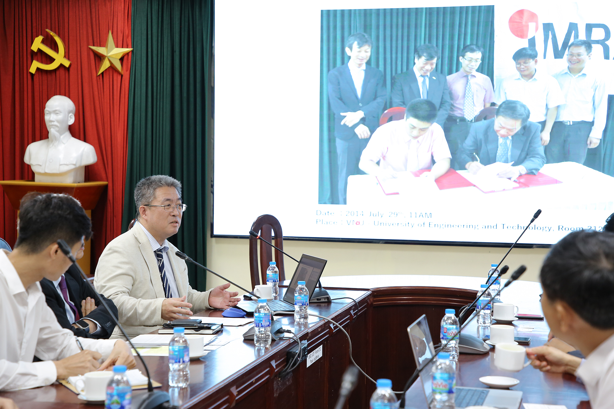 Sau báo cáo kết quả nghiên cứu giữa hai bên, ông Hiroshi Tauchi – Chủ tịch Công ty IMRA, Nhật Bản đánh giá cao sự hợp tác và đồng hành của các giảng viên khoa Vật lý kỹ thuật và công nghệ nano trong quá trình nghiên cứu tại Nhật Bản. Những hợp tác này đã mang lại các kết quả nghiên cứu thiết thực đối với Công ty cũng như các công trình khoa học trên các tạp chí quốc tế. Vì vậy, ông Hiroshi Tauchi mong muốn, giai đoạn tiếp theo hai bên sẽ tiếp tục đẩy mạnh những hoạt động trong lĩnh vực trao đổi cán bộ, nghiên cứu sinh và tổ chức hội thảo để phát huy thế mạnh hợp tác và phát triển.