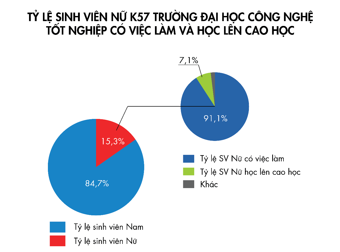 Một chi tiết thú vị là hơn 98% số sinh viên nữ được khảo sát cho biết có việc làm ngay sau khi ra trường 1 năm hoặc đi học tiếp. Nữ giới chiếm trên 15% số sinh viên toàn khóa K57.