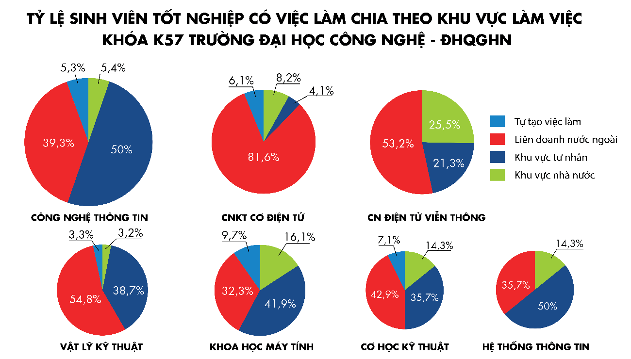 Kết quả cho thấy lượng sinh viên đi làm trong liên doanh nước ngoài ở tất cả các ngành có tỷ lệ rất cao, chiếm 44,9% tổng lượng sinh viên được khảo sát. Điều này là kết quả của sự hợp tác mật thiết giữa trường với các doanh nghiệp và tập đoàn nước ngoài như Panasonic, Samsung, LG, Humax, v.v. Trong khi đó, khối doanh nghiệp tư nhân tuyển dụng đến hơn 32% số sinh viên tốt nghiệp, với các công ty có tên tuổi như Viettel, VNPT, FPT, v.v. Với đà mở rộng hợp tác của trường Đại học Công nghệ như hiện nay, xu hướng ứng tuyển vào khối doanh nghiệp nước ngoài và doanh nghiệp tư nhân chắc chắn còn tăng trong các năm tới.