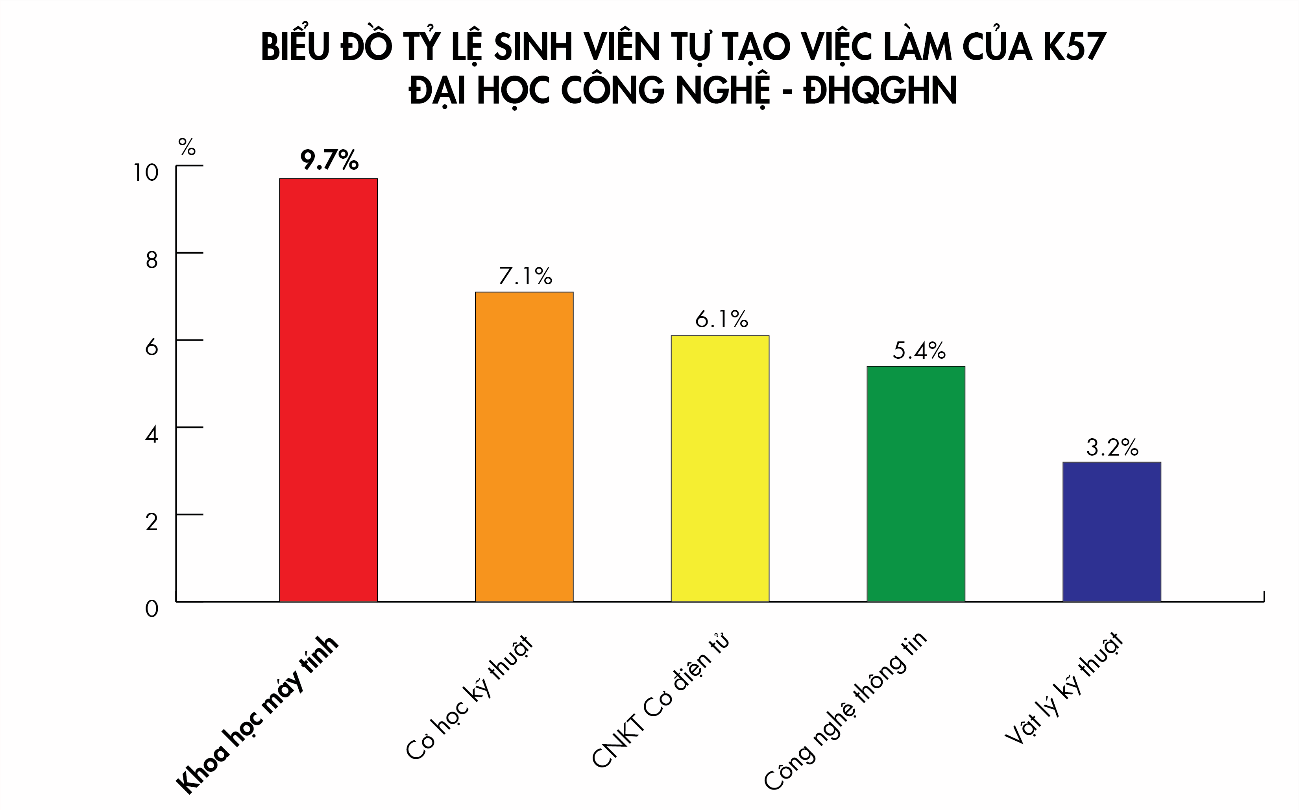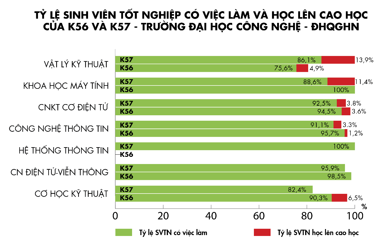 Niên khóa K57 của trường Đại học Công nghệ có tổng số 367 sinh viên tốt nghiệp, trong đó có 327 sinh viên trả lời khảo sát của nhà trường, chiếm trên 89% tổng số. Tính đến tháng 1 năm 2018, đã có tới 91,1% số sinh viên được khảo sát đã có việc làm. Đây là tỷ lệ sinh viên ra trường có việc làm cao vào loại nhất trong số các trường đại học kỹ thuật lớn của miền Bắc công bố tính đến đầu năm 2018.