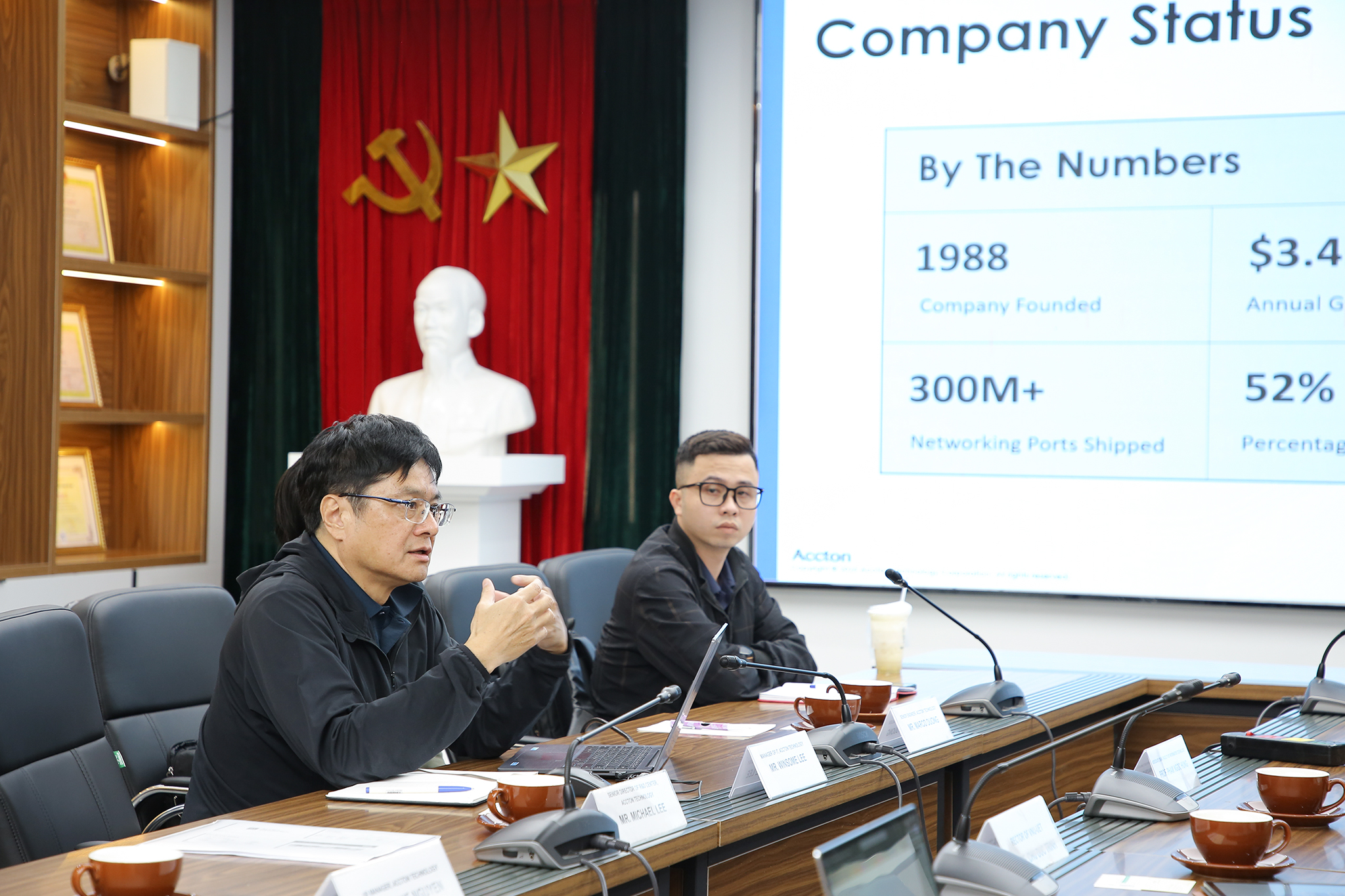 Tại buổi gặp mặt, ông Michael Lee – Giám đốc cấp cao Trung tâm R&D đã chia sẻ về chiến lược phát triển của Accton tại Việt Nam, đồng thời bày tỏ mong muốn hợp tác với Trường ĐH Công nghệ trong công tác đào tạo và tuyển dụng. Sau quá trình trao đổi giữa hai bên, Hiệu trưởng Chử Đức Trình cùng lãnh đạo các khoa đã giới thiệu về thế mạnh của Nhà trường trong đào tạo kỹ sư công nghệ cao, đặc biệt là trong lĩnh vực bán dẫn, với nhiều chương trình hợp tác cùng các tập đoàn lớn như Samsung, LG… Trường ĐH Công nghệ hiện là một trong những đơn vị đào tạo hàng đầu về công nghệ kỹ thuật tại Việt Nam, với mạng lưới hợp tác rộng khắp cùng các doanh nghiệp quốc tế.
